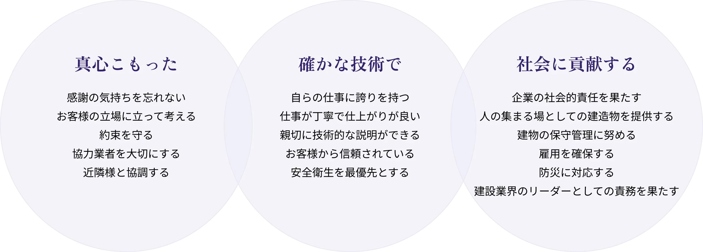 感謝の気持ちを忘れないお客様の立場に立って考える約束を守る協力業者を大切にする近隣様と協調する