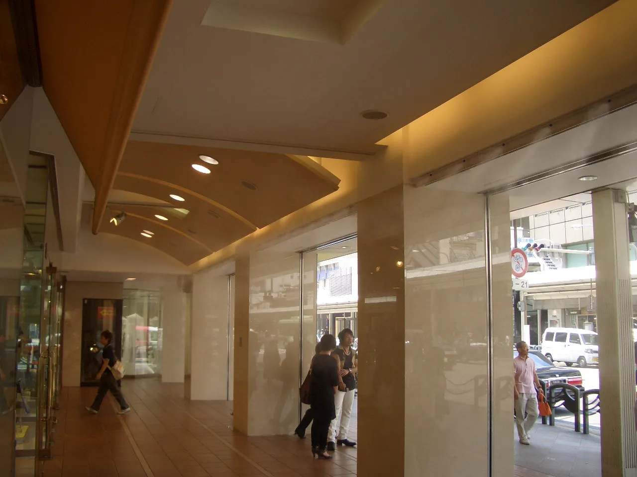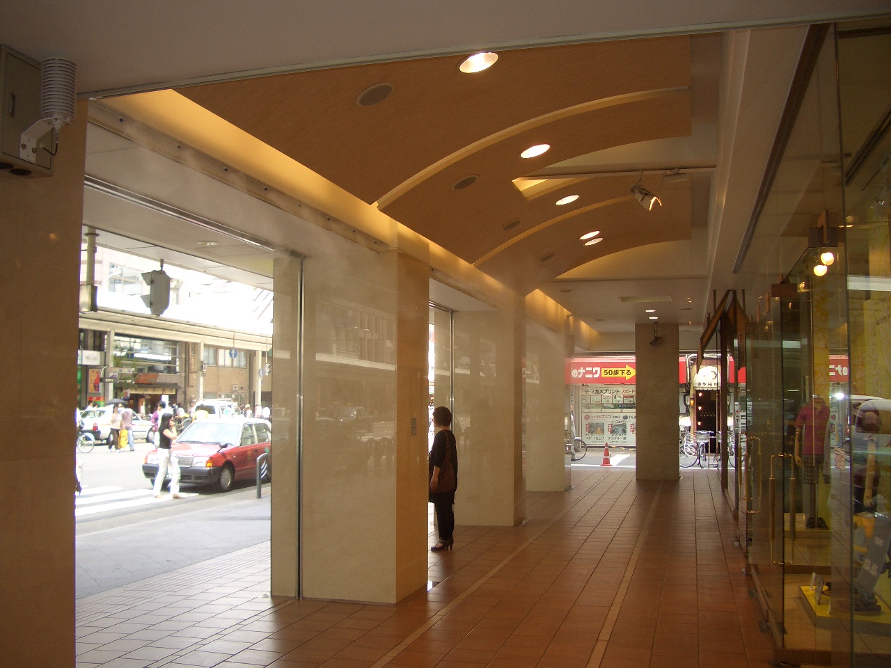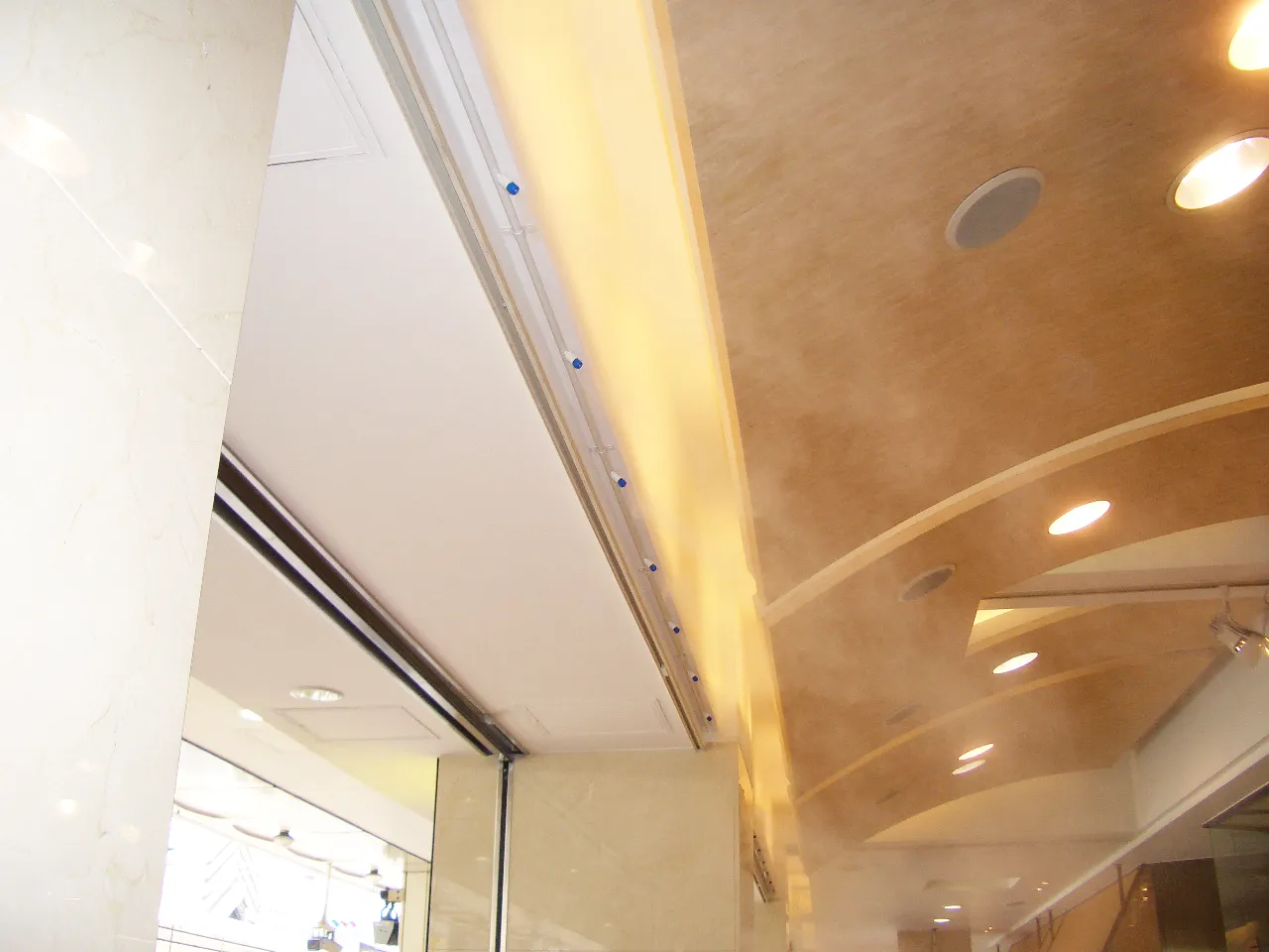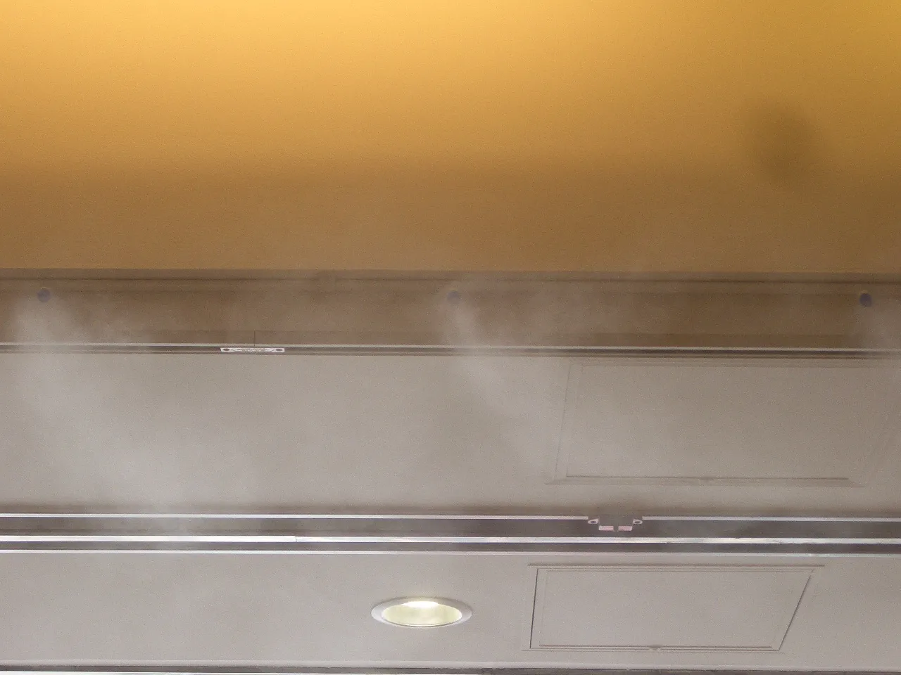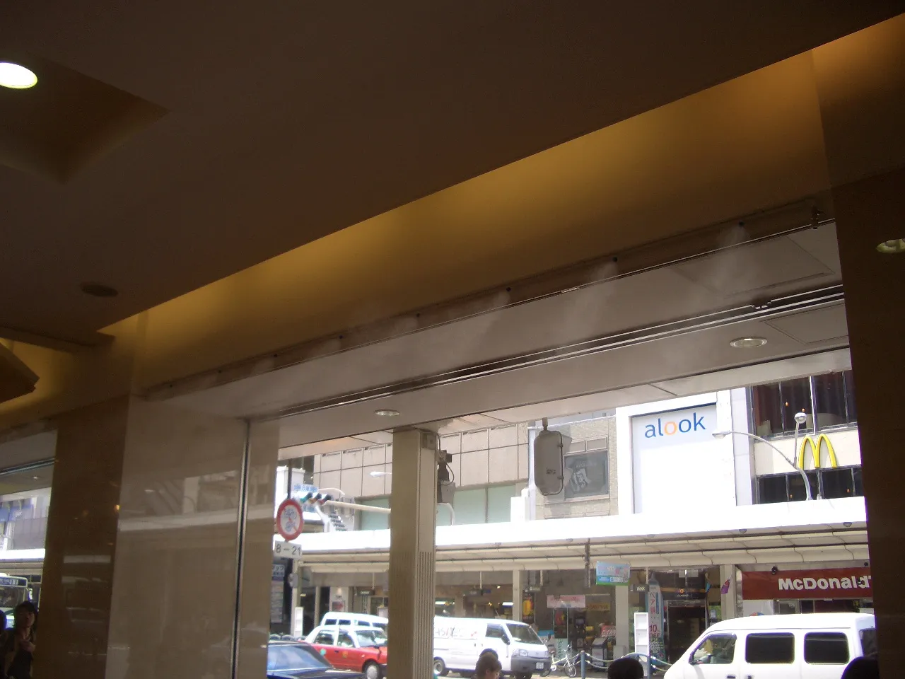 『濡れない霧』が売りのシステムですが、不特定多数の人が集まる百貨店の正面玄関に設置とあり女性の方や着物を召された方がこの霧を避けられるように、間口5スパンの内3スパンのみに設置し、1スパン1mに対し噴射ノズル8箇所、合計24個のノズルを店頭天井面に取り付け、制御盤・高圧ポンプは地階に設置し耐圧ステンレス製ホースを無ジョイントで天井内に配管としました。また、制御には温・湿度センサーと週間タイマーにより運転時間の制御を行い、さらに外気温等により停止期間が長くなった場合は、配管内の水の腐敗を防ぐ為に1日1回は温・湿度に関らず夜間に15分間噴霧するシステムになっています。